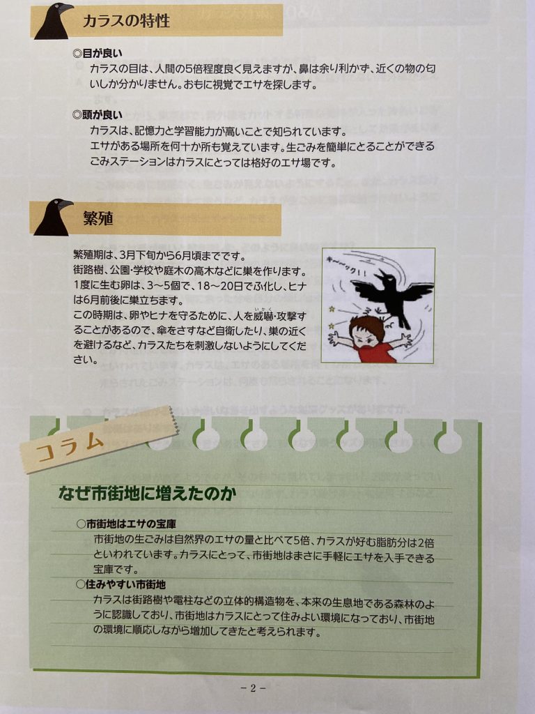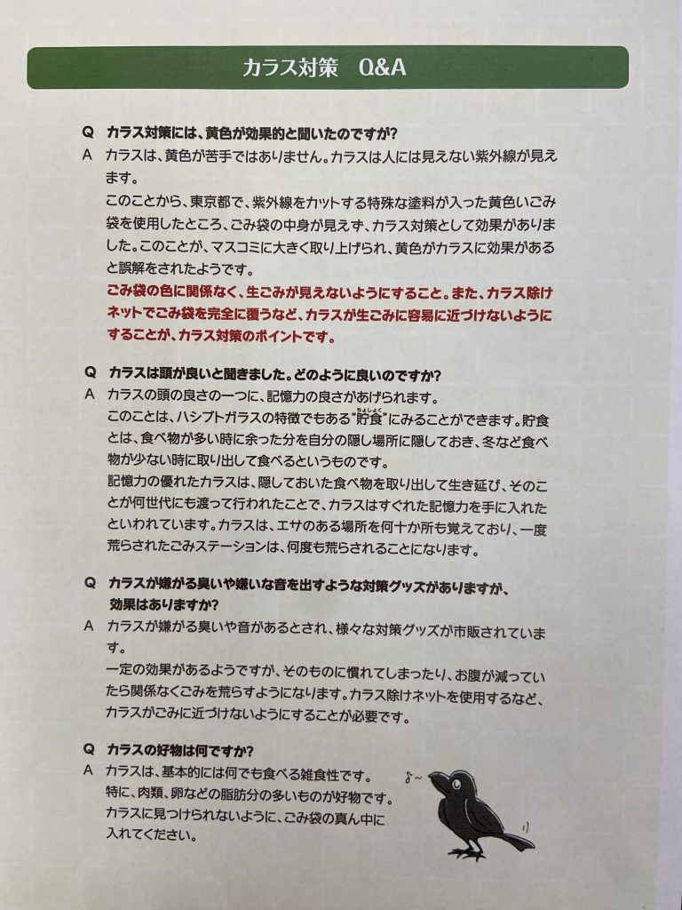 最近、カラスに荒らされるごみステーションが増えています、可燃ごみは火曜日と土曜日の朝に出しましょう。カラスに荒らされないように奥まで入れて、カラス避けネットをしかりと被せてくださいね!!