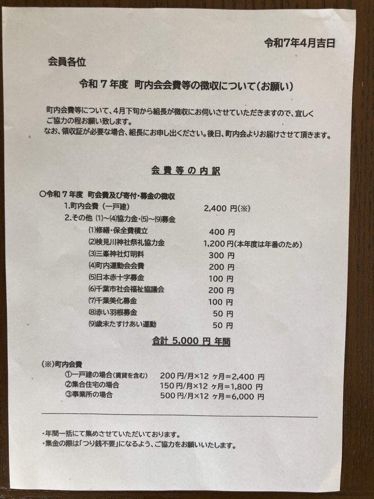 担当組長が4月下旬より町内会費の集金に伺いますのでよろしくお願いします。