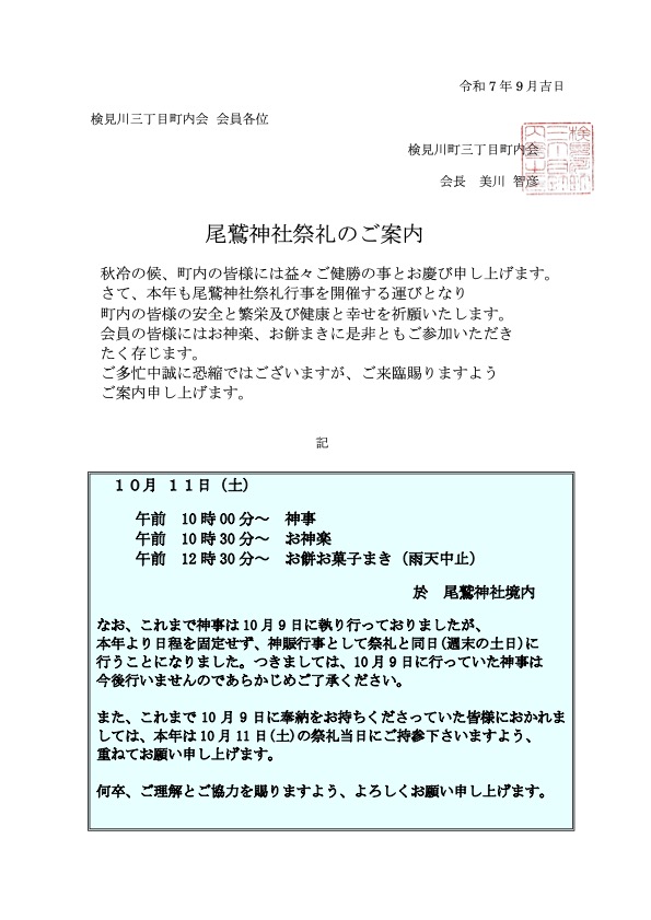 日頃より、検見川町三丁目町内会の活動にご理解とご協力をいただき、誠にありがとうございます。本年度より町内会長を務めさせていただくことになりました、美川です。微力ではございますが、地域の皆さまのお力をお借りしながら、安心・安全で住み良い町づくりに務めてまいります。 私たちの町は、長年に渡り地域のつながりを大切にしながら発展してまいりました。今後もその良き伝統を守りつつ、時代に合わせた新しい取り組みにも挑戦してまいります。特に防災や見守り活動、高齢者支援、子供たちの健やかな成長を支える場づくりなどに力をいれていきたいと考えております。また、LINE公式アカウントの導入など、情報発信の充実にも取り組み、皆さまとのコミュニケーションを大切にしていきたいと思っております。町内の皆さまが安心して暮らし、気軽に交流できる地域づくりのために、どうぞ引き続きご支援・ご協力のほど、よろしくお願い申し上げます。