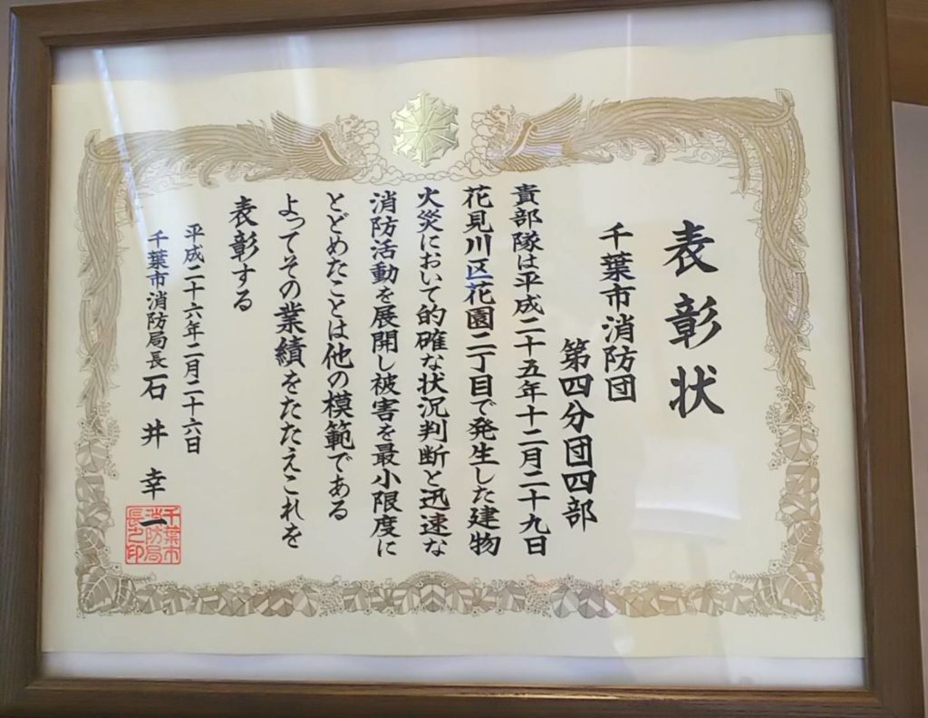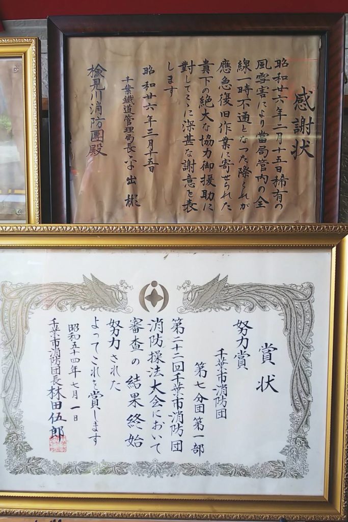 検見川消防団(千葉市消防団第4分団4部)の下村です。現在検見川消防団は8名で活動しております。内1名が女性で4名が60歳以上です。全国の消防団の例に漏れず定員不足、高齢化が進んでおります。3丁目にある消防団器具置場(消防車両、消防器具の置場で団員の待機及び集合場所です。)には今までの活動に対する表彰状や感謝状、消防大会出場時の賞状等が数多く飾られております。その中にはJRの前の国鉄、更に前の省線電車と呼ばれていた頃の感謝状等もあり、全国でも有数の歴史ある消防団です。その消防団が廃部にならないよう(花見川区では昨年度で廃部になった部があります。)日々団員の募集を行っておりますので、「自分の住む町の防災は任せろ!」という方はぜひ入団を検討してみてください。幸い検見川地区は町内皆様の防災意識の高さから、他の地区に比べ火災の少ない地区だと思います。それは定期的に行われる連合町内会主催の防火・防災訓練等の賜だと思います。また検見川神社の例大祭やどんと祭、町民運動会、検見川フェスタやあびな等町内の皆様の団結力も大きな要因だと思います。これからも町内の皆様と共に検見川の防災のため団員一同頑張ってまいりますので、よろしくお願いいたします。